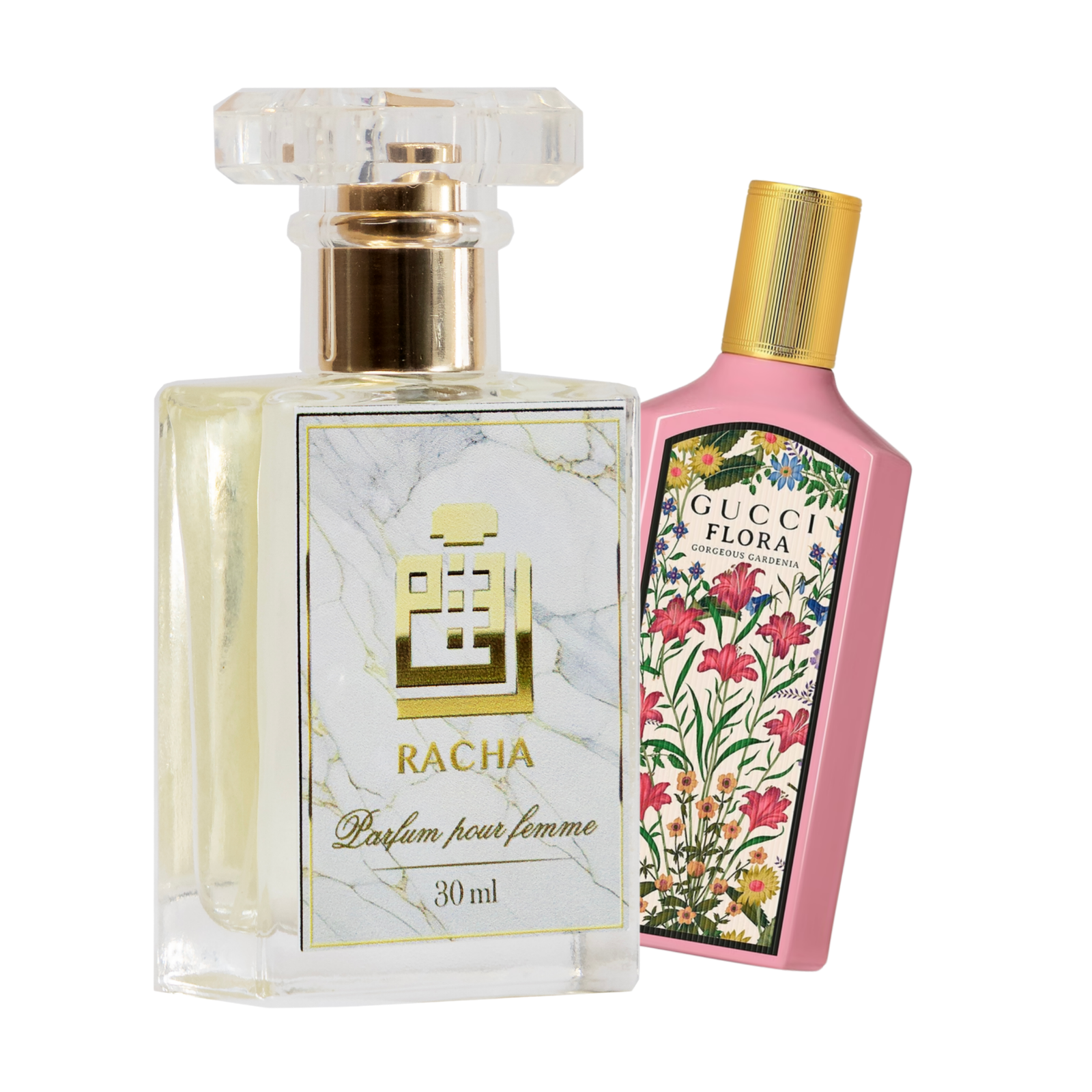 Racha te propose sa version inspirée de Gucci Flora Gorgeous Gardenia : une fragrance florale-fruitée, douce et lumineuse, parfaite pour la femme romantique et rayonnante.